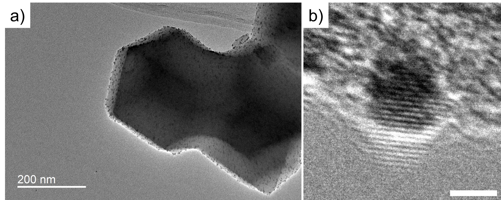 Figure 3 shows the TEM and HRTEM image of the Pt-doped ZIF8@ZIF67 core-shell structure. The crystal at ~200nm size is the ZIF8@ZIF67, and the black dot distributed in ZIF8@ZIF67 is the Pt nanoparticle. In the HRTEM, we can see the lattice fringe of the Pt nano-particle but cannot see the lattice of ZIF8@ZIF67. It is because the MOF sample is sensitive to the electron beam, therefore, the crystal was damaged. In contrast, the Pt nano-particle is stable to electron beam irradiation.